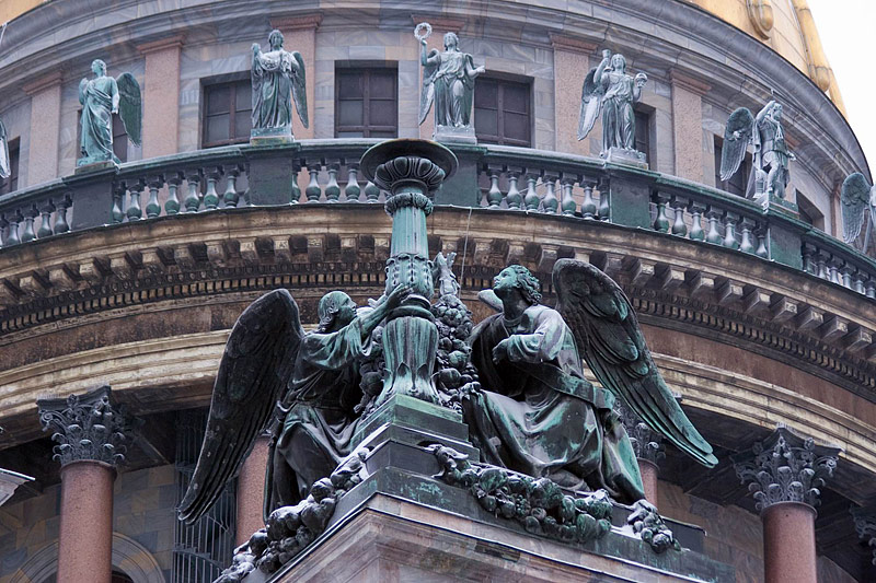 While the cathedral was being constructed, Auguste de Montferrand fulfilled several other commissions, overseeing the repair and completion of Kazan Cathedral (1827-1837), and designing the Alexander Column on Palace Square as a memorial to his mentor, Alexander I (1829-1834). His final project was the Monument to Nicholas I in front of St. Isaac's Cathedral, commissioned by Alexander II in 1856.