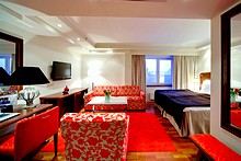 The Original Sokos Hotel Olympia Garden's Suites are large open-plan rooms featuring the hotel's signature decor by Finnish designer Jaakko Puro, which combines traditional elegance and modern comfort, with parquet floors, polished-wood furnishings, white walls, and bright and welcoming modern fabrics. Measuring between 36 and 44 square meters, Suites have furniture including king-size or twin single beds, a writing desk, large coffee table, plush sofa, two armchairs, and large wardrobe.