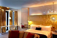 The W Hotel's entry-level Wonderful Rooms are large and very luxurious, measuring between 27 and 33 square meters, and feature a king-size bed, large work desk with office chair, and comfortable armchair. Unique design features include patterned headboards, gold lamps by Terzani, and diamond-cut lacquered doors. Large windows of all Wonderful Rooms face the hotel's inner courtyard. Connecting rooms and rooms with disabled access are available on request.